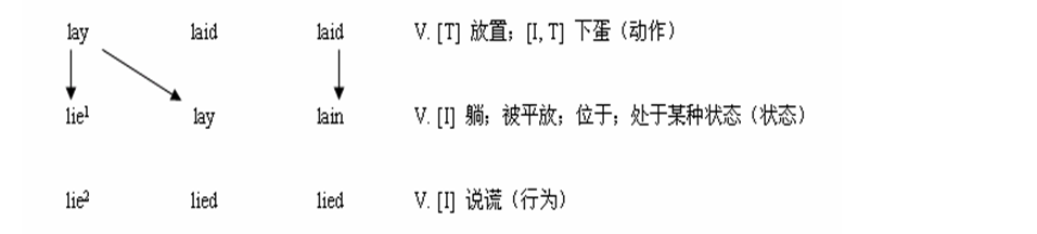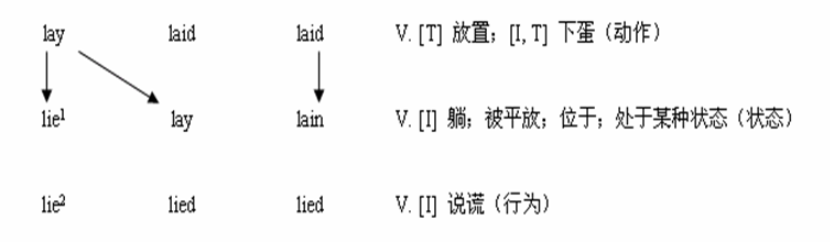 lay與lie用法辨析 ■本站特約作者 薄金成 Ⅰ. 詞義、詞性(如上圖所示) A. lay vt. laid, laid放置;vi.&vt.下(蛋) They laid the injured woman (down) on the grass. 他們把受傷的女人放在草地上。 Last week they laid 30 eggs, but this week the hens aren’t laying. 上星期那些母雞下了三十個蛋,但本周沒有下蛋。 B. lie1 v. [I] lay lain躺;位于;被平放;處于某種狀態 He lay down for a rest. 他躺下休息一會。 There was a book lying on the table. 桌子上平放著一本書。(主動形式表被動意義) I have lain awake all night thinking of them. 我心里想著他們,徹夜未眠。 C. lie2 v. [I] 說謊 She lied (to them) about her age in order to get the job. 她為了謀得那份工作(向他們)隱瞞了年齡。 [辨別正誤]:他向我撒謊說他昨天病了。 He lied me that he was ill yesterday. (×) He lied to me that he was ill yesterday. (×) He told me a lie that he was ill yesterday. (√) Ⅱ. 科學識記 A. 動詞變化 1.lay v [T] 放置;[I, T]下蛋:是ABB形式。 2. lie1 v [I] lay lain躺;位于;被平放;處于某種狀態:是ABC形式。 3. lie2 v [I] 說謊:是規則變化 B. 單詞拼寫 1. lay(v [T] laid, laid放置;[I, T]下蛋)的原形、過去式及過去分詞都排在lie1 的(v [I] lay lain躺;被平放;位于;處于某種狀態)之前 2. lie1(v [I] lay lain躺;被平放;位于;處于某種狀態)的過去式和lay (v [T] laid, laid放置;[I, T]下蛋)的原形一致。 The meeting is over. 會議結束了。 Is anyone upstairs? 樓上有人嗎? Is the radio on or off? 收音機是開著的還是關著的? 【注】在通常情況下,用作表語時不用副詞而用形容詞,如可說The woman is beautiful. 而不說 The woman is beautifully. 可說The cloth feels soft. 不能說 The cloth feels softly. 英語中用作表語的副詞主要是表地點的副詞以及某些與介詞同形的副詞,而且只能用于連系動詞be 后作表語,而不用于其他連系動詞后作表語,如可說He is here 或 He is abroad,但不能說He seems here 或 He seems abroad。 引用地址: |